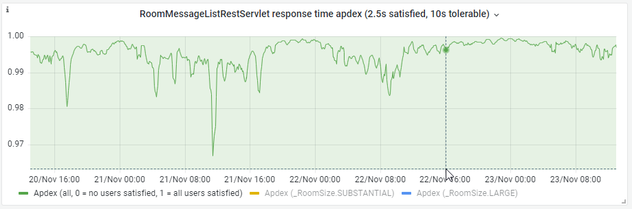 Note that the graph from the first image, and the second graph from the second image are apdexes, which is a measure that shows improvement when it goes up (as opposed to e.g. response times, which improve when they go down).